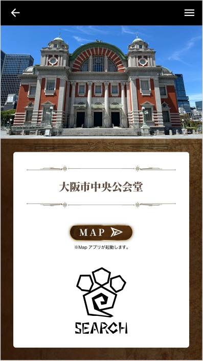 調査スポット周辺に行き、詳細画面から「SEARCH」をタップ